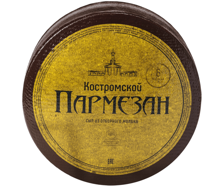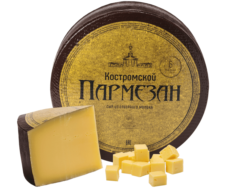 «Костромской Пармезан» — это твердый сыр, изготовленный из коровьего молока, который готовится исключительно из натуральных компонентов, благодаря чему обладает насыщенным вкусом и ароматом. Срок созревания этого сыра 6 и 12 месяцев. В нем отчетливо слышен вкус молока с нотками трав и цветов, имеется сливочный аромат и деликатный сладко-солоноватый вкус. В процессе более длительного созревания сыр приобретает уникальный сложный вкус, сочетающий в себе оттенки фруктов и орехов, а также ярко-выраженный аромат, и более ломкую кристаллическую структуру, по сравнению с молодым 6-ти месячным. Этот сорт сыра по праву считается королем среди всех твердых сыров и «must-have» на кухне у любой хорошей хозяйки. Сыр прекрасен во всех блюдах, а не только как яркое дополнение итальянской кухни (пиццы, пасты), и конечно его принято употреблять в пищу самостоятельно. Лучшее сочетание для него — сочные фрукты (яблоки, груши, дыня), а также спелая клубника. Идеальная винная пара — легкое фруктовое красное вино. Нужно отметить, что это еще и кладезь нутриентов и витаминов: Ca (кальций), P (фосфор), K (калий) витамины: A, B6, B2, B12, C, E.